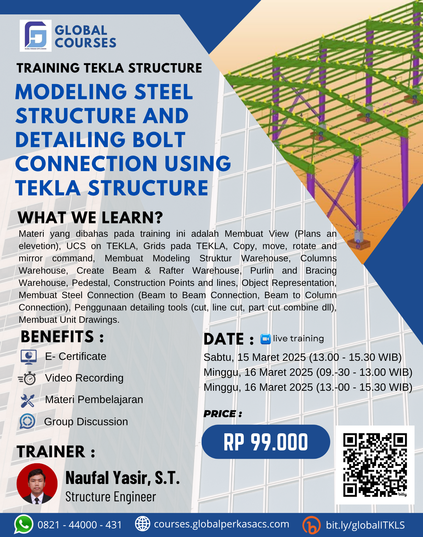 Materi yang akan dijelaskan pada webinar ini mencakup pembuatan model struktur baja menggunakan Tekla Structure, teknik detailing sambungan baut yang sesuai standar, pengaturan parameter sambungan, optimasi model untuk keperluan fabrikasi, serta tips meningkatkan efisiensi proses perencanaan dan konstruksi.