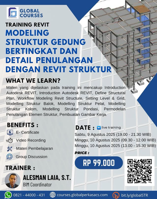 Materi yang dijelaskan pada training ini mencakup Introduction Autodesk REVIT, Introduction Autodesk REVIT, Define Structural Plan, Workflow Modeling Revit Structure, Setting Level & Grid, Modelling Struktur Balok, Modelling Struktur Pelat, Modelling Struktur Kolom, Modelling Struktur Pondasi, Permodelan Penulangan Elemen Struktur, Pembuatan Gambar Kerja.