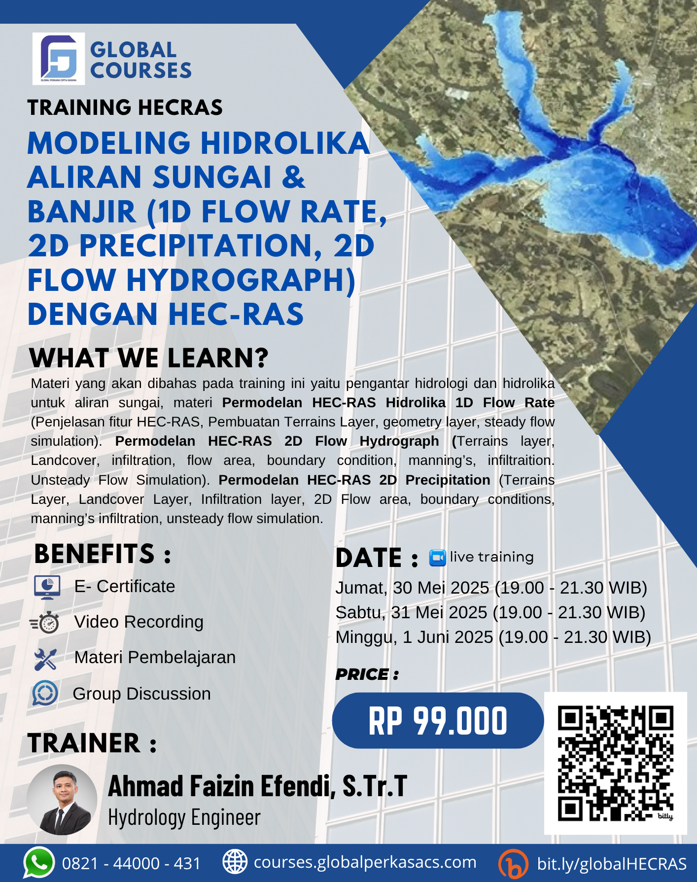 Materi meliputi pemodelan hidrolika aliran sungai, simulasi banjir 1D & 2D, analisis debit puncak, pengolahan data hidrologi, dan interpretasi hasil simulasi dengan HEC-RAS.